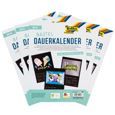 folia Dauerkalender mit 12 Monatsblättern, die mit einem immerwährenden Kalendarium bedruckt sind, mit Spiralbindung und Aufhängebügel, Farbe: schwarz mit silberner Schrift, Größe: 21 x 29,7 cm (DIN A4), Gewicht: 210 g/m², Inhalt: 5 Stück.