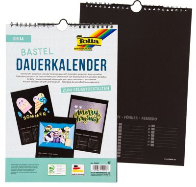 folia Dauerkalender mit 12 Monatsblättern, die mit einem immerwährenden Kalendarium bedruckt sind, mit Spiralbindung und Aufhängebügel, Farbe: schwarz mit silberner Schrift, Größe: 21 x 29,7 cm (DIN A4), Gewicht: 210 g/m².