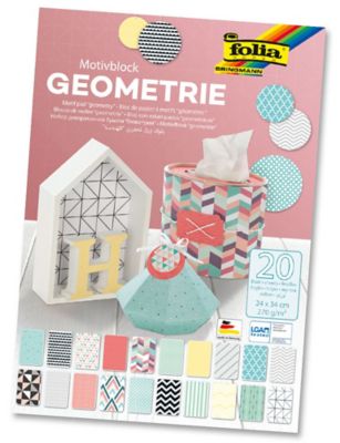 folia Papierblock "Geometrie", Vorderseite: bedruckt, Rückseite: weiß, Größe: 24 x 34 cm, Gewicht: 270 g/m², Inhalt: 20 Blatt.