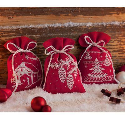 Geschenksäckchen "Weihnacht Rot/Weiß", im 3er-Set, zum Besticken nach Zählvorlage in Kreuzstich (ca. 7 Stiche/cm), halbkonfektioniert. Ideal für kleine Präsente oder als Kräutersäckchen. Komplettpackung: Anleitung, Zählvorlage, Garn, Sticknadel. Stofffarbe: rot. Größe: 8 x 12 cm. Material: Aida-Stoff und Garn 100 % Baumwolle.