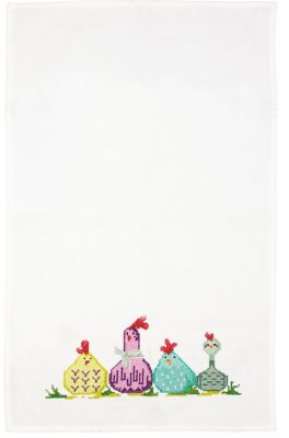 Geschirrtuch "Bunte Hühner", zum Besticken Kreuzstich. Fertig genäht mit vorgedrucktem Motiv. Komplettpackung: Anleitung, Garn, Sticknadel. Stofffarbe: weiß. Größe: 46 x 71 cm. Material: Stoff und Garn 100 % Baumwolle.