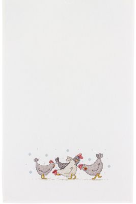 Geschirrtuch "Hühner", zum Besticken in Kreuzstich. Fertig genäht mit vorgedrucktem Motiv. Komplettpackung: Anleitung, Garn, Sticknadel. Stofffarbe: weiß. Größe: 46 x 71 cm. Material: Stoff und Garn 100 % Baumwolle.