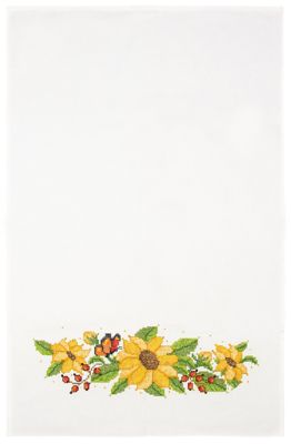 Geschirrtuch "Sonnenblumen", zum Besticken in Kreuz- und Knötchenstich. Fertig genäht mit vorgedrucktem Motiv. Komplettpackung: Anleitung, Garn, Sticknadel. Stofffarbe: weiß. Größe: 46 x 71 cm. Material: Stoff und Garn 100 % Baumwolle.
