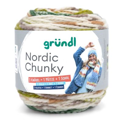 gründl Nordic Chunky. Perfekt für Pfundskerle und Pfundsmädels, die es gerne mollig warm haben wollen! Das ganz schön pfundige Wollmisch-Garn besteht aus zwei voluminösen Dochtfäden, die einfach miteinander verzwirnt sind und so ein ausdrucksstarkes Maschenbild erzeugen. Ruckzuck zaubern Neulinge, Fortgeschrittene und Profis neue, pflegeleichte und wärmende Strickstücke wie Pullis, Jacken oder Accessoires für die kalten Herbst- und Wintertage. Der Farbverlauf, der direkt aus dem Garn kommt, fasziniert durch seine fantastisch aufeinander abgestimmten Nuancen und der melierten Optik. Sie werden begeistert sein und Ihren neuen Strick-Style lieben!
