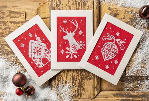 Grußkarten "X-Mas rot-weiß", im 3er-Set, zum Besticken nach Zählvorlage in Kreuzstich (ca. 7 Stiche/cm). Komplettpackung: Anleitung, Zählvorlage, Garn, Sticknadel, 3 Grußkarten, 3 Umschläge. Stofffarbe: rot. Größe: 10,5 x 15 cm, Stoffgröße: 10 x 14 cm. Material: Aidastoff und Garn 100 % Baumwolle.