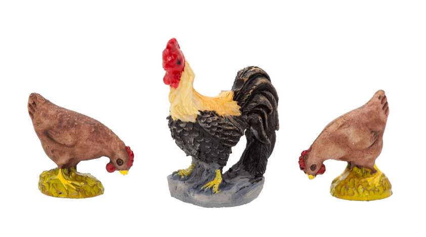 Hahn und Hühner aus Polyresin, Größe: 1–3,5 cm, Inhalt: Hahn, 2x Huhn.