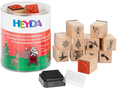 Heyda Stempel-Set "Weihnachten" zum Basteln von Karten, für Scrapbooking uvm., Motivgröße: 1,5 cm, Inhalt: 15 verschiedene Holz-Motivstempel und 1 Stempelkissen in Schwarz.
