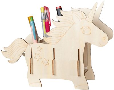 Holzbausatz Stiftehalter Einhorn, Größe: 25 x 19 cm, Inhalt: 7 Teile. Vorgestanzte Einzelteile vorsichtig ausbrechen, zusammenpuzzlen, mit Holzleim fixieren – fertig!