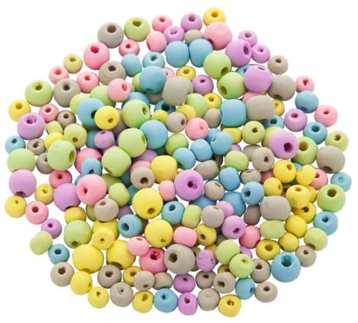 Holzperlen-Mix rund, Farben: grau, grün, gelb, rosa, violett, blau, Größe: 6–8 mm Ø, Inhalt: 50 g = ca. 340 Stück.