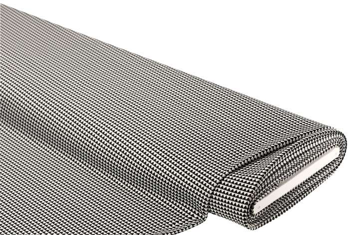 Jacquard-Jersey "Dreiecke", Farbe: schwarz/weiß, querelastisch, Motivgröße: 5 mm, Breite: 150 cm, Gewicht: ca. 225 g/m². Material: 95 % Polyester, 5 % Elasthan.
