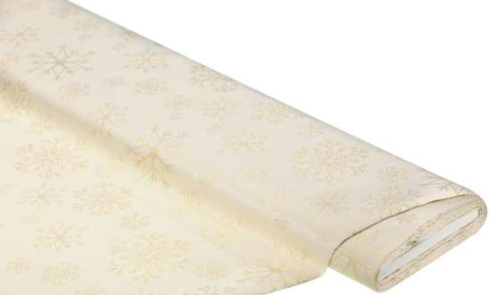 Winterlicher Jacquard "Schneekristalle" mit Glitzergarn, Farbe: natur/gold, Motivgröße: 3–10 cm Ø, Breite: 180 cm, Gewicht: ca. 115 g/m². Einlaufwert: ca. 1 % in Länge und Breite. Material: 70 % Polyester, 30 % Metallfaser.