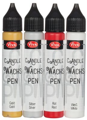 Kerzen-Pen "Weihnachts-Set", ffür tollen 3D-Effekt. Dieses Wachs kann zur Herstellung von Wachsfolien verwendet werden und direkt aus dem Stift oder auch mit dem Pinsel auf Kerzen aufgetragen werden. Farben: weiß, rot, gold, silber, Inhalt: 4x 28 ml.