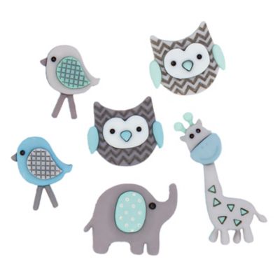 Kinderknöpfe Dschungel, Größe: 15–35 mm, Inhalt: 6 Stück, Motive: 1x Giraffe, 1x Elefant, 2x Vogel, 2x Eule, Material: Kunststoff. Achtung: Nicht geeignet für Kinder unter 3 Jahren!