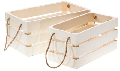 Diese beiden praktischen sowie dekorativen Kisten aus Holz lassen sich super als Aufbewahrungsmöglichkeit für Bücher, Zeitschriften, Badetücher und Co. verwenden. Genauso gut lassen sich damit auch liebgewonnene Dekogegenstände oder Pflanzen in Szene setzen. Oder Sie funktionieren die Kisten einfach als eine Art Regal um. Die Möglichkeiten sind vielfältig - werden Sie doch einfach selbst kreativ. Und wem die Kisten in natura noch ein wenig zu farblos sind, der kann einfach zu Pinsel und Farbe greifen und ihnen einen ganz individuellen Look verpassen.