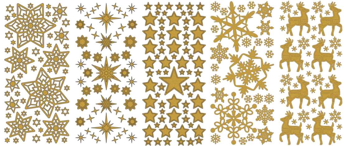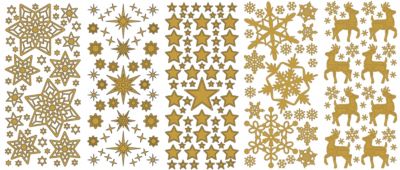 Klebesticker "Weihnachten 1", einseitig klebend, Farbe: gold, Bogengröße: 23 x 10 cm, Motivgröße: 0,7–7,5 cm, Inhalt: 5 Bogen.
