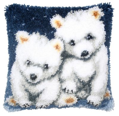 Knüpfkissen "2 Eisbären-Babys". Komplettpackung: Anleitung, Garn. Ohne Kissenrücken, Kissenfüllung, Knüpfhaken. Größe: 40 x 40 cm. Material: Stoff handbemalter Stramin 52 % Baumwolle, 48 % Polyester (ca. 18 Stiche/10 cm), Garnschnittpackungen 100 % Polyacryl.