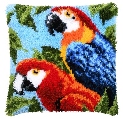 Knüpfkissen "2 Papageien". Komplettpackung: Anleitung, Garn. Ohne Kissenrücken, Kissenfüllung, Knüpfhaken. Größe: 40 x 40 cm. Material: Stoff handbemalter Stramin 52 % Baumwolle, 48 % Polyester (ca. 18 Stiche/10 cm), Garnschnittpackungen 100 % Polyacryl.