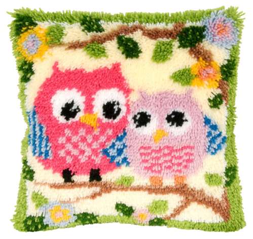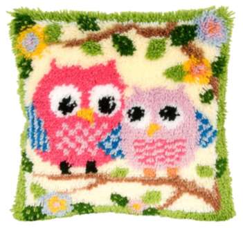 Knüpfkissen "Eulenpaar". Komplettpackung: Anleitung, Garn. Ohne Kissenrücken, Kissenfüllung, Knüpfhaken. Größe: 40 x 40 cm, Material: Stoff handbemalter Stramin 52 % Baumwolle, 48 % Polyester (ca. 18 Stiche/10 cm), Garnschnittpackungen 100 % Polyacryl.