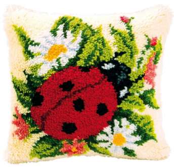 Knüpfkissen "Marienkäfer". Komplettpackung: Anleitung, Garn. Ohne Kissenrücken, Kissenfüllung, Knüpfhaken. Größe: 40 x 40 cm. Material: Stoff handbemalter Stramin 52 % Baumwolle, 48 % Polyester (ca. 18 Stiche/10 cm), Garnschnittpackungen 100 % Polyacryl.