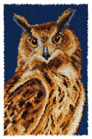 Knüpfteppich "Eule". Komplettpackung: Anleitung, Garn, Knüpfhaken. Größe: 50 x 74,5 cm. Material: bedruckter Stramin 50 % Baumwolle, 50 % Polyester (ca. 18 Stiche/10 cm), Garnschnittpackungen 100 % Polyacryl.