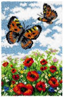 Knüpfteppich "Schmetterlinge". Komplettpackung: Anleitung, Garn, Knüpfhaken. Größe: 50 x 74,5 cm. Material: bedruckter Stramin 50 % Baumwolle, 50 % Polyester (ca. 18 Stiche/10 cm), Garnschnittpackungen 100 % Polyacryl.