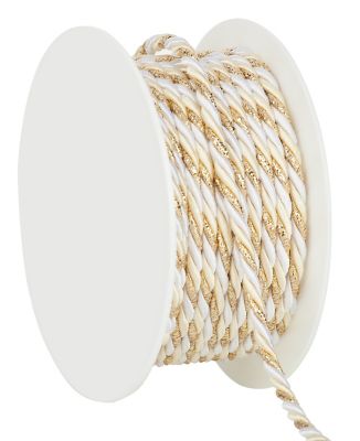 Kordel, dreifarbig, Farbe: creme-weiß-gold, Stärke: 4 mm, 10 m pro Rolle. Material: 67 % Baumwolle, 28 % Acetat, 5 % Polyester.