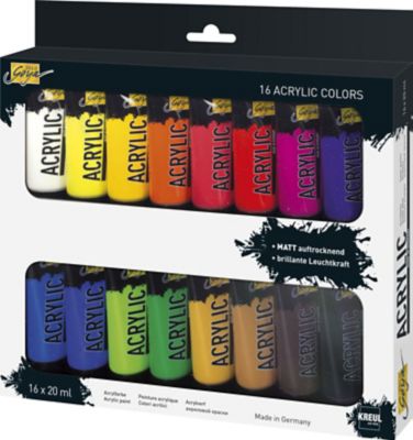 Kreul Künstler-Acrylfarben. Das Set besteht aus 16 aufeinander abgestimmten Acrylfarben auf Wasserbasis, die für eine Vielzahl von Untergründen, wie Leinwand, Papier, Stein, Metall, Holz, Leder und viele Kunststoffe, geeignet sind. Sie trocknen matt auf, sind wasserfest und sowohl für den Innen- als auch den Außenbereich geeignet. Inhalt: 16x 20 ml.