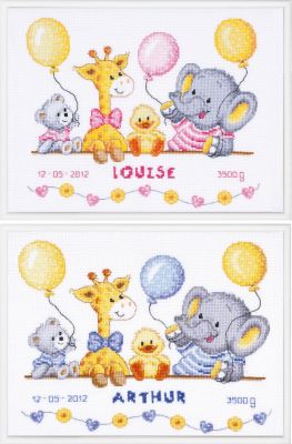 Kreuzstichbild "Baby Tiere". Komplettpackung mit Arbeitsanleitung, Zählvorlage, Alphabet, Zahlen, Garn und Sticknadel, ohne Rahmen, inkl. Garn in Blau und Rosa. Die Zählvorlage enthält alle Buchstaben des Alphabets und alle Zahlen, somit können Sie jeden Namen und jedes Datum beliebig einsticken. Stofffarbe: weiß, Größe: 27 x 22 cm, Stickerei: 23 x 19 cm. Material: Aida-Stoff und Garn 100 % Baumwolle (ca. 5,4 Stiche/cm).