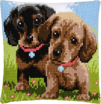 Kreuzstichkissen "2 Dackel". Superleicht zu sticken, geeignet für Kinder ab 8 Jahren. Komplettpackung: Anleitung, Garn, Sticknadel. Ohne Kissenrücken und -füllung. Größe: 40 x 40 cm. Material: Stoff handbemalter Stramin 100 % Baumwolle (ca. 18 Stiche/10 cm), Garn 100 % Polyacryl.