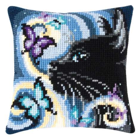 Kreuzstichkissen "Black Cat". Superleicht zu sticken, geeignet für Kinder ab 8 Jahren. Komplettpackung: Anleitung, Garn, Sticknadel. Ohne Kissenrücken und -füllung. Größe: 40 x 40 cm. Material: Stoff handbemalter Stramin 100 % Baumwolle (ca. 18 Stiche/10 cm), Garn 100 % Polyacryl.