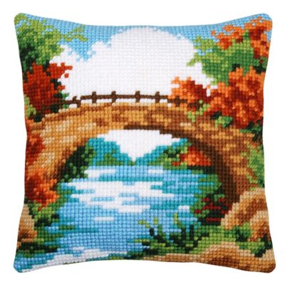 Kreuzstichkissen "Brücke am Fluss". Superleicht zu sticken, geeignet für Kinder ab 8 Jahren. Komplettpackung: Anleitung, Garn, Sticknadel. Ohne Kissenrücken und -füllung. Größe: 40 x 40 cm. Material: Stoff handbemalter Stramin 100 % Baumwolle (ca. 18 Stiche/10 cm), Garn 100 % Polyacryl.