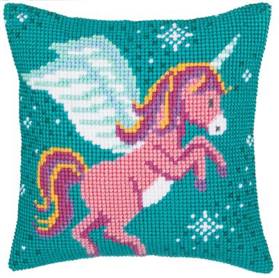 Kreuzstichkissen "Einhorn". Superleicht zu sticken, geeignet für Kinder ab 8 Jahren. Komplettpackung: Anleitung, Garn, Sticknadel. Ohne Kissenrücken und -füllung. Größe: 40 x 40 cm. Material: Stoff handbemalter Stramin 100 % Baumwolle (ca. 18 Stiche/10 cm), Garn 100 % Polyacryl.