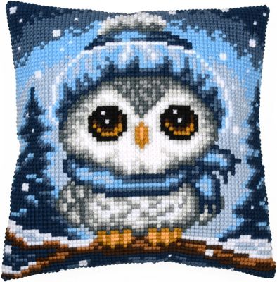 Kreuzstichkissen "Eule mit Mütze". Superleicht zu sticken, geeignet für Kinder ab 8 Jahren. Komplettpackung: Anleitung, Garn, Sticknadel. Ohne Kissenrücken und -füllung. Größe: 40 x 40 cm. Material: Stoff handbemalter Stramin 100 % Baumwolle (ca. 18 Stiche/10 cm), Garn 100 % Polyacryl.