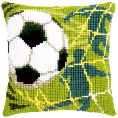 Kreuzstichkissen "Fußball". Superleicht zu sticken, geeignet für Kinder ab 8 Jahren. Komplettpackung: Anleitung, Garn, Sticknadel. Ohne Kissenrücken und -füllung. Größe: 40 x 40 cm. Material: Stoff handbemalter Stramin 100 % Baumwolle (ca. 18 Stiche/10 cm), Garn 100 % Polyacryl.
