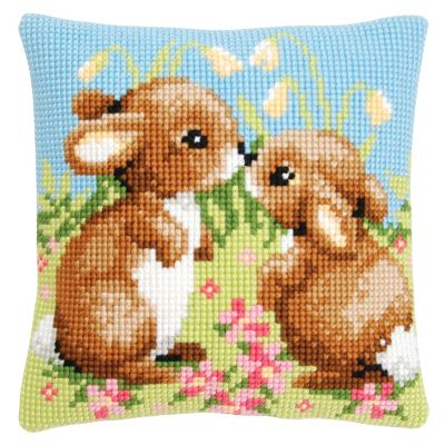 Kreuzstichkissen "Häschenpaar", superleicht zu sticken, geeignet für Kinder ab 8 Jahren. Komplettpackung mit Arbeitsanleitung, Garn und Sticknadel. Ohne Kissenrücken und –füllung. Größe: 40 x 40 cm, Material: handbemalter Stramin 100 % Baumwolle (ca. 18 Stiche/ 10 cm), Garn 100 % Polyacryl.