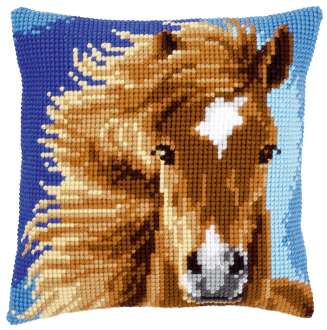 Kreuzstichkissen "Isländer Pferd". Superleicht zu sticken, geeignet für Kinder ab 8 Jahren. Komplettpackung: Anleitung, Garn, Sticknadel. Ohne Kissenrücken und -füllung. Größe: 40 x 40 cm. Material: Stoff handbemalter Stramin 100 % Baumwolle (ca. 18 Stiche/10 cm), Garn 100 % Polyacryl.