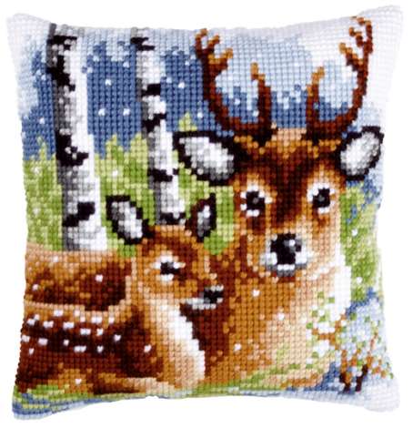 Kreuzstichkissen "Reh & Kitz". Superleicht zu sticken, geeignet für Kinder ab 8 Jahren. Komplettpackung: Anleitung, Garn, Sticknadel. Ohne Kissenrücken und -füllung. Größe: 40 x 40 cm. Material: Stoff handbemalter Stramin 100 % Baumwolle (ca. 18 Stiche/10 cm), Garn 100 % Polyacryl.