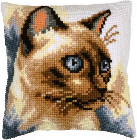 Kreuzstichkissen "Siam-Katze". Superleicht zu sticken, geeignet für Kinder ab 8 Jahren. Komplettpackung: Anleitung, Garn, Sticknadel. Ohne Kissenrücken und -füllung. Größe: 40 x 40 cm. Material: Stoff handbemalter Stramin 100 % Baumwolle (ca. 18 Stiche/10 cm), Garn 100 % Polyacryl.