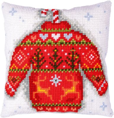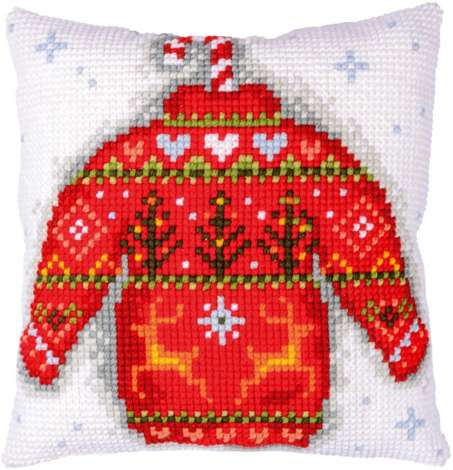 Kreuzstichkissen "Winter-Pulli". Superleicht zu sticken, geeignet für Kinder ab 8 Jahren. Komplettpackung: Anleitung, Garn, Sticknadel. Ohne Kissenrücken und -füllung. Größe: 40 x 40 cm. Material: Stoff handbemalter Stramin 100 % Baumwolle (ca. 18 Stiche/10 cm), Garn 100 % Polyacryl.
