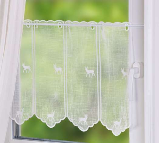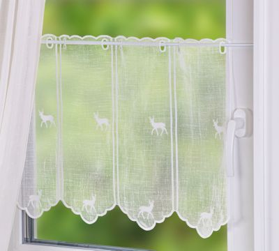 Kurzgardine "Hirsch", bestickt, Farbe: ecru, Rapport: 16 cm, Motivgröße: 5 x 4,5 cm, Material: 100 % Polyester.