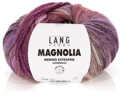 Lang Yarns Magnolia. Verwöhnen Sie sich mit dieser wunderschönen Wolle von Lang Yarns. Ähnlich wie eine Magnolienknospe entfaltet Magnolia langsam Ihr beeindruckendes Erscheinungsbild; Masche für Masche enthüllt Sie den sanften Farbverlauf, der, wie die Magnolie in der japanischen Mythologie, für wundervolle Weiblichkeit steht. Stricken Sie Pullover, Jacken, Schals und andere Accessoires und lassen Sie sich liebevoll von Ihren neuen Strickstücken umgarnen. Sie werden nicht nur hübsch aussehen, sondern sich dank des weichen Materialmixes aus extrafeiner Merinowolle und Polyamid auch pudelwohl fühlen.