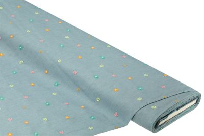 Leichter Hemdenjeans „Blumen“ bestickt, Farbe: hellblau/bunt, Motivgröße Blume türkis: 1,5 cm Ø, Breite: 130 cm, Gewicht: ca. 130 g/m². Material: 100 % Baumwolle.