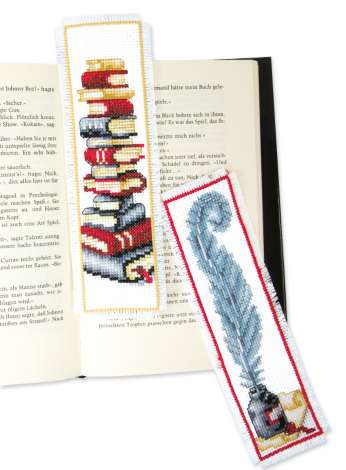 Lesezeichen "Lesen & Schreiben" im 2er-Set, zum Besticken in Kreuzstich. Komplettpackung mit Arbeitsanleitung, Zählvorlage, Garn und Sticknadel. Stofffarbe: weiß, Größe: 6 x 20 cm, Material: Aida-Stoff und Garn 100 % Baumwolle (ca. 5,4 Stiche/cm).