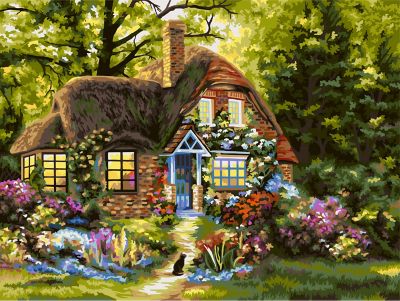 Malen nach Zahlen auf Leinwand "Feenhaus", Inhalt: Keilrahmen mit vorgedrucktem Motiv in der Größe 40 x 50 cm, Acrylfarben, Pinsel und Anleitung.