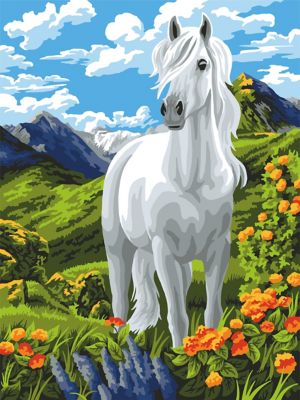 Malen nach Zahlen "Weißes Pferd", Inhalt: Malkarton mit vorgedrucktem Motiv in der Größe 30 x 40 cm, Acrylfarben, Pinsel und Anleitung.