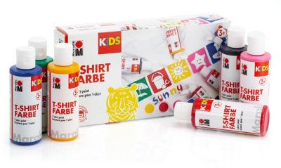 Marabu KiDS T-Shirt Farben, im Backofen fixieren (8 Min., 150°C) oder bügelfixieren und waschfest bis 60 °C, Farben: gelb, rot, pink, blau, grün und schwarz, Inhalt: 6x 80 ml. Für Kinder ab 3 Jahren geeignet.