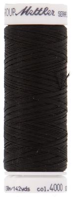 Mettler Seraflex, Farbe: schwarz, Fadenstärke: 120, Nadelstärke: 70–80, 130 m pro Spule. Material: 100 % Polytrimethylenterephthalat.
