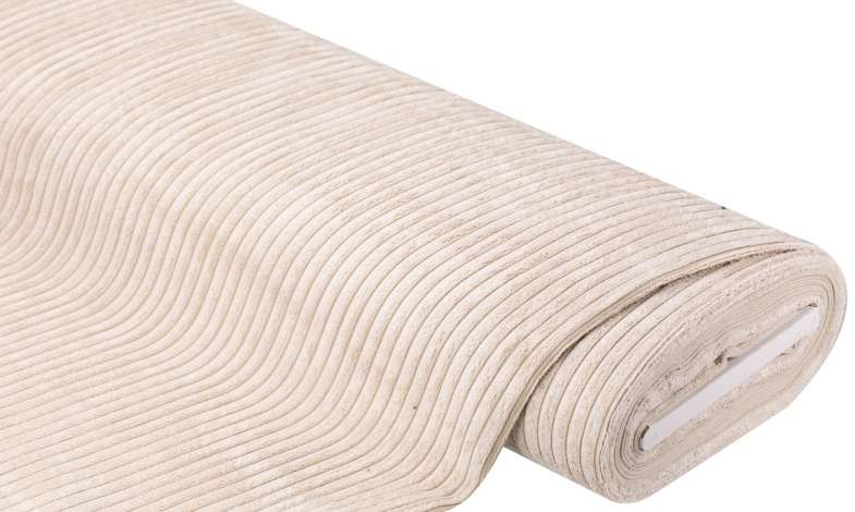 Möbel-Breitcord, Farbe: natur, Rippenbreite: 12 mm, mit weißem textilem Untergewebe, Scheuerwert: 50.000 Touren, Lichtechtheit: 5, Breite 140 cm, Gewicht: ca. 325 g/m². Material: 92 % Polyester, 8 % Polyamid.