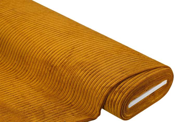 Möbel-Breitcord, Farbe: zimt, Rippenbreite: 12 mm, mit weißem textilem Untergewebe, Scheuerwert: 50.000 Touren, Lichtechtheit: 5, Breite 140 cm, Gewicht: ca. 325 g/m². Material: 92 % Polyester, 8 % Polyamid.