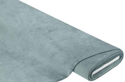 Möbel-Cord, Farbe: jade, Rippenbreite: 4 mm, mit weißem textilem Untergewebe, Scheuerwert: 40.000 Touren, Lichtechtheit: 4, Breite 140 cm, Gewicht: ca. 280 g/m². Material: 90 % Polyester, 10 % Polyamid.